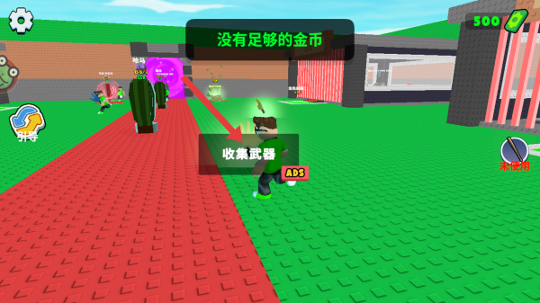 2、若金币不足,会弹出没有足够的金币提示,此时可选择收集武器,通过看广告等方式获取武器,为后续购买做准备。